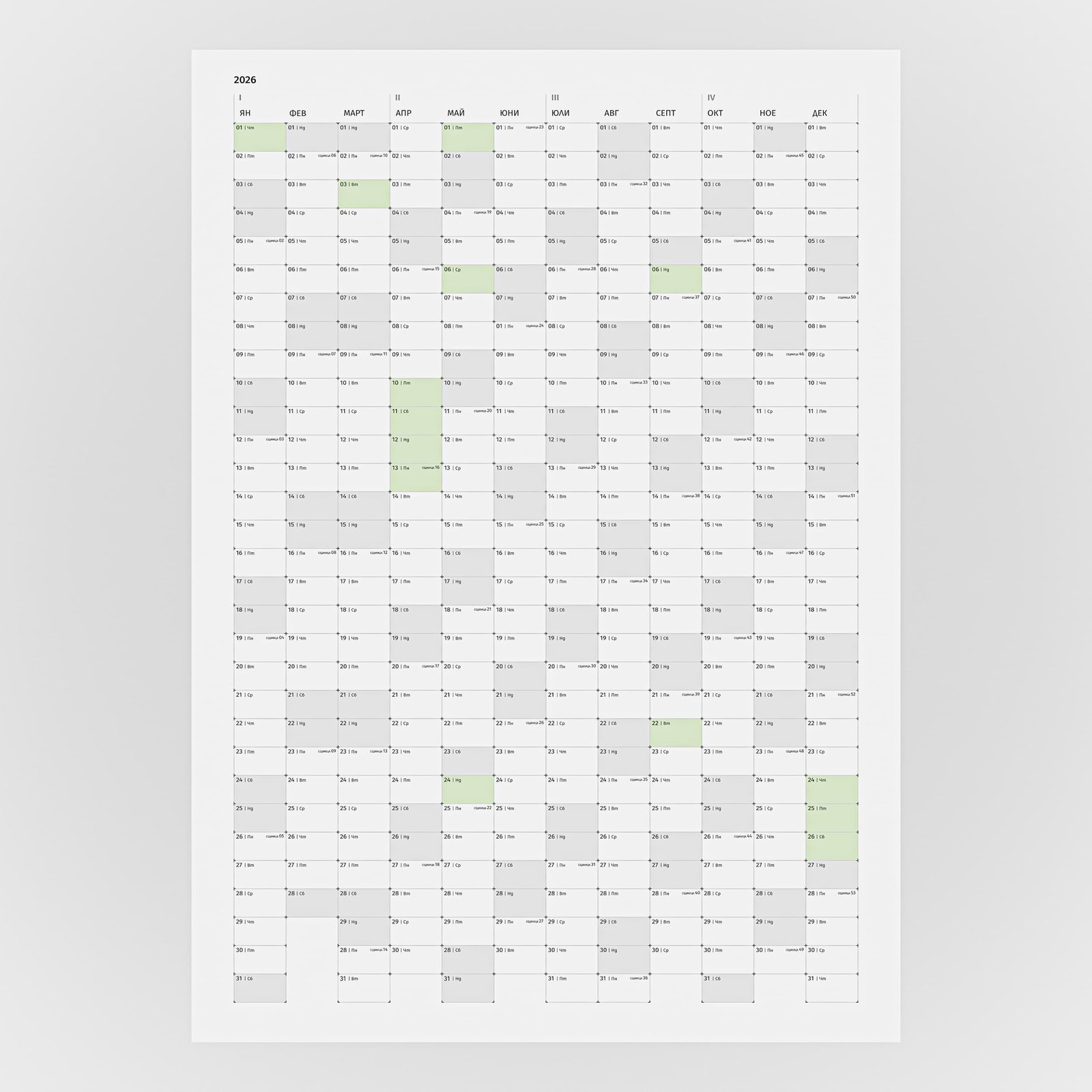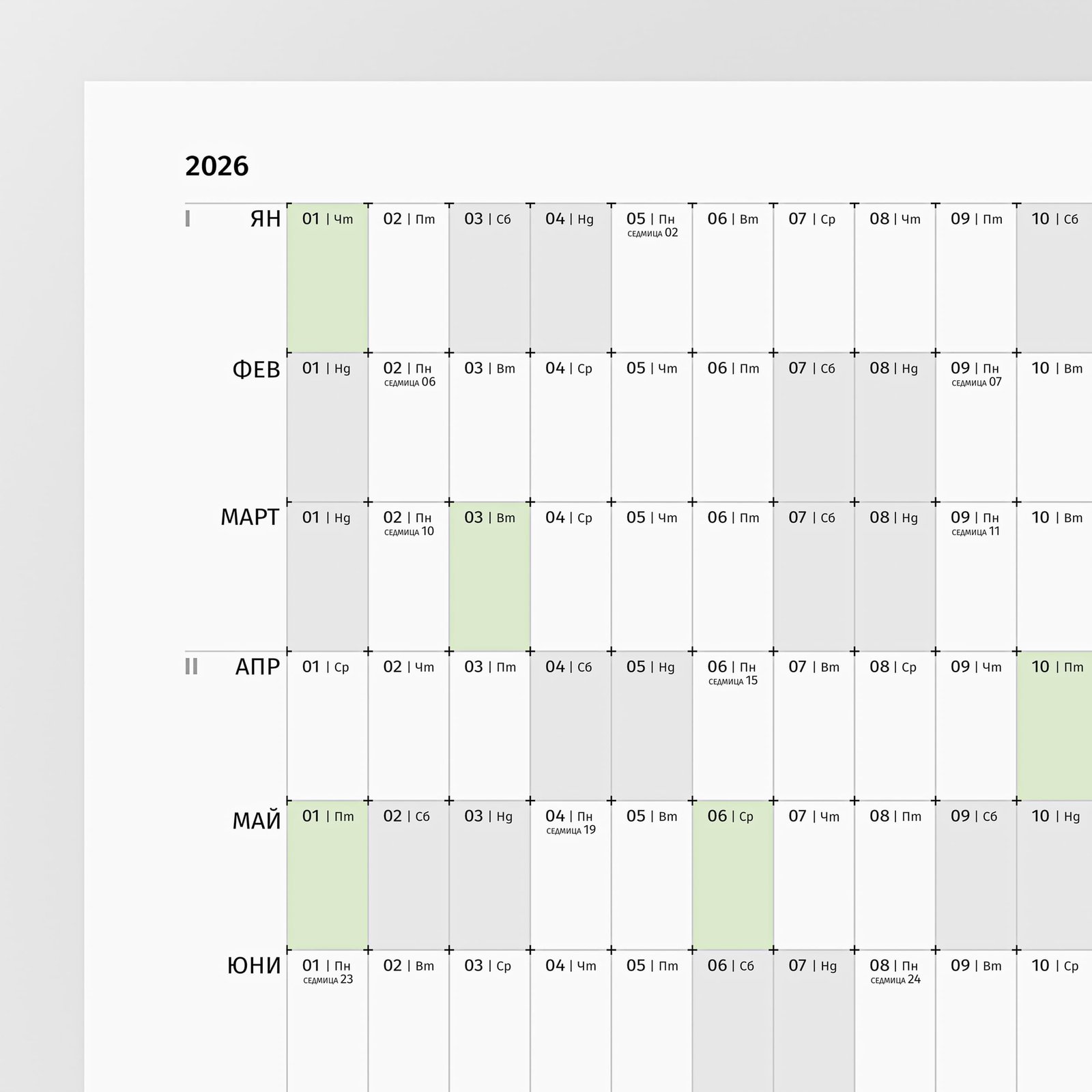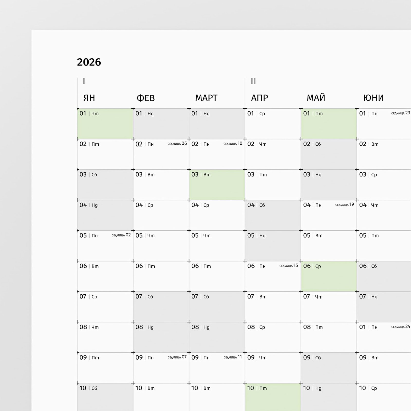 Без декоративни елементи, без визуален шум – само времето, подредено в мрежа, която дава възможност да управляваш цялата си година в един поглед.