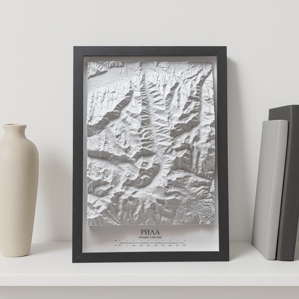 Минималистичното черно-бяло излъчване и прецизният релеф правят този обект едновременно стилна интериорна декорация и уникален подарък за планинари, туристи, фотографи и любители на българската природа. Компактният размер 21×30 см го прави идеален за бюро, рафт или стена, без да заема излишно пространство.