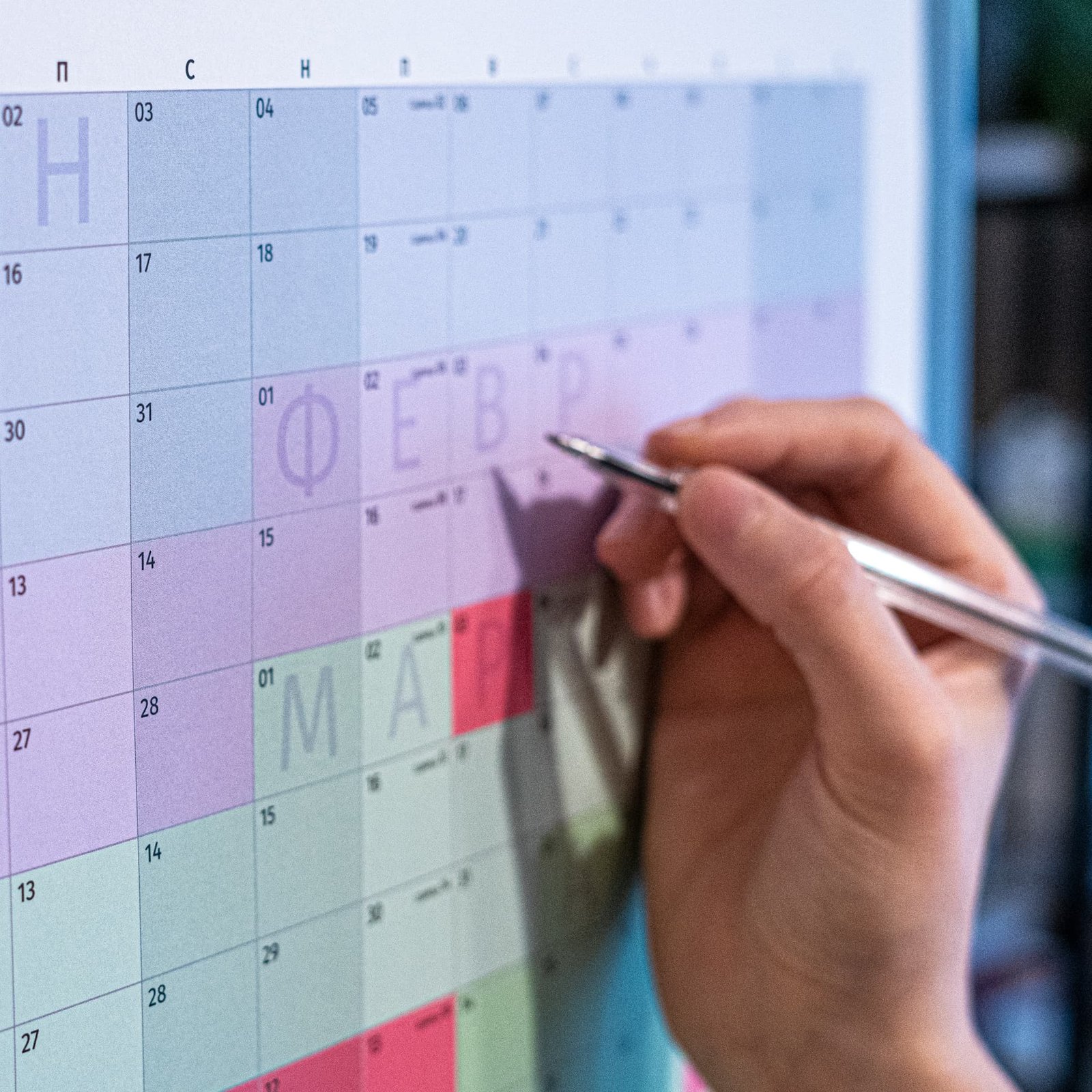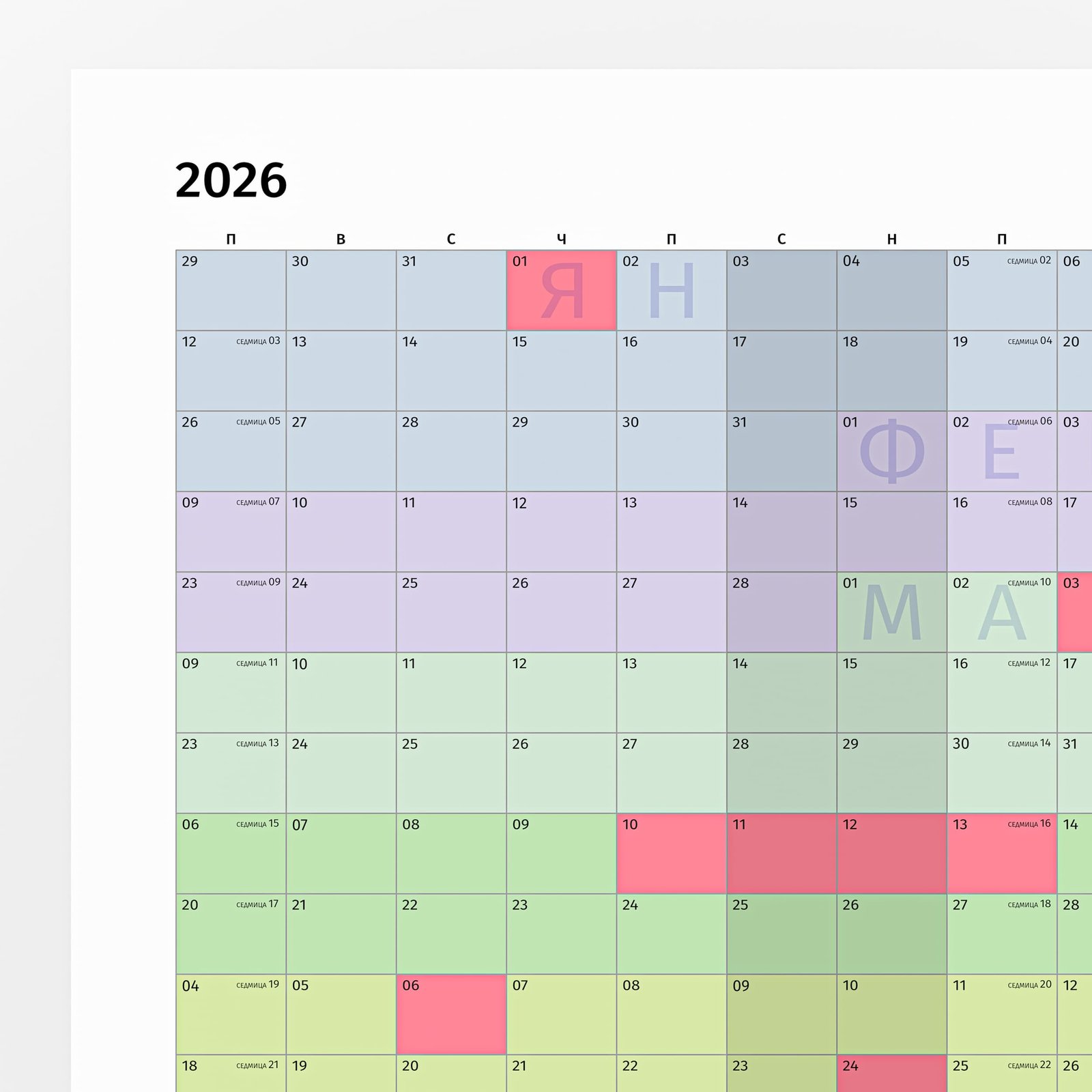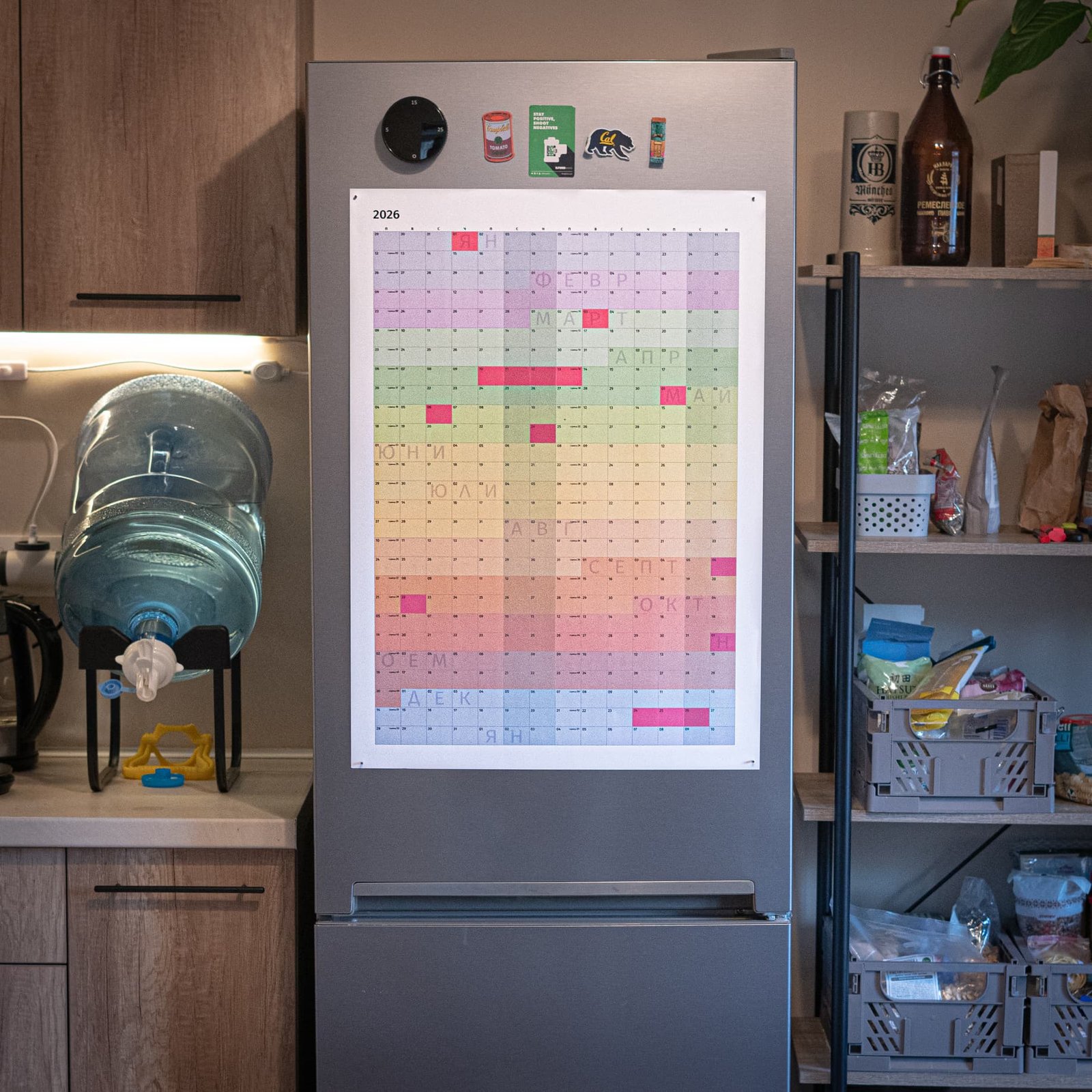Вместо сухи таблици, тук годината живее през цветове – от хладните тонове на зимата до топлите на лятото и меките есенни нюанси. Цветовият градиент не е само декоративен – той подобрява ориентацията във времето, носи настроение и прави планирането по-приятно.